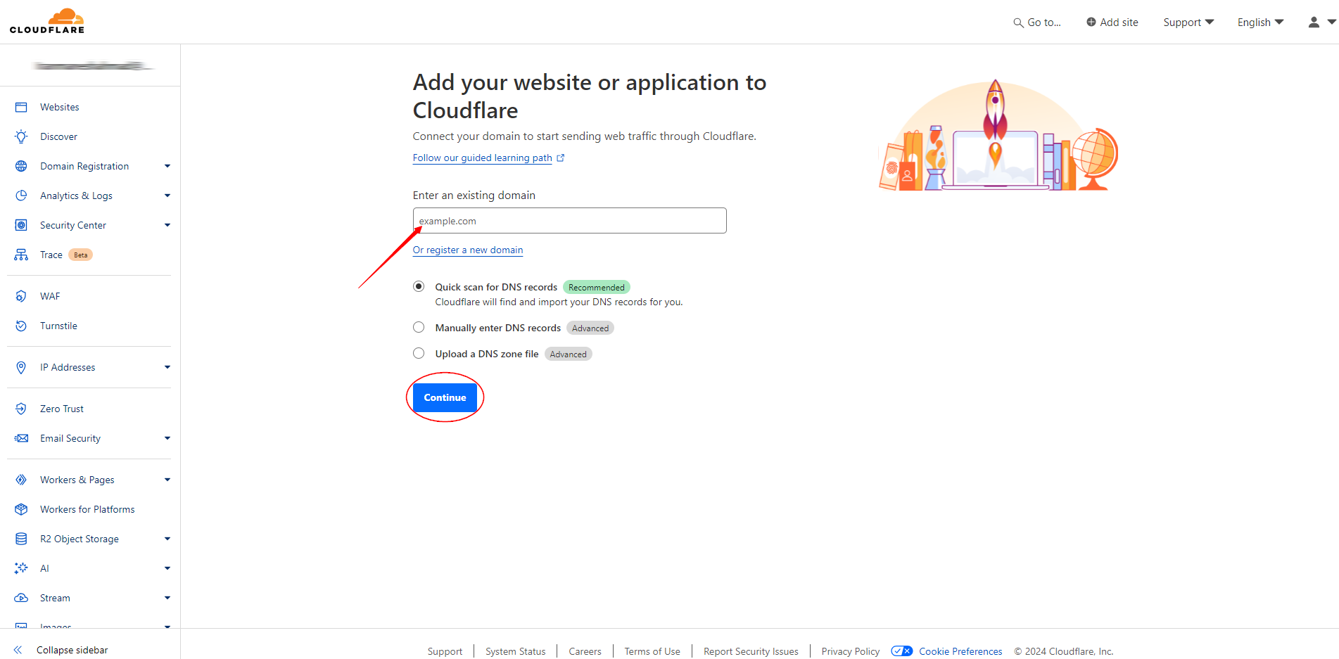 برای اضافه کردن دامنه خود در میبایست نام دامنه را در فیلد Enter an existing domain وارد کنید، سپس بر روی گزینه Continue کلیک کنید.