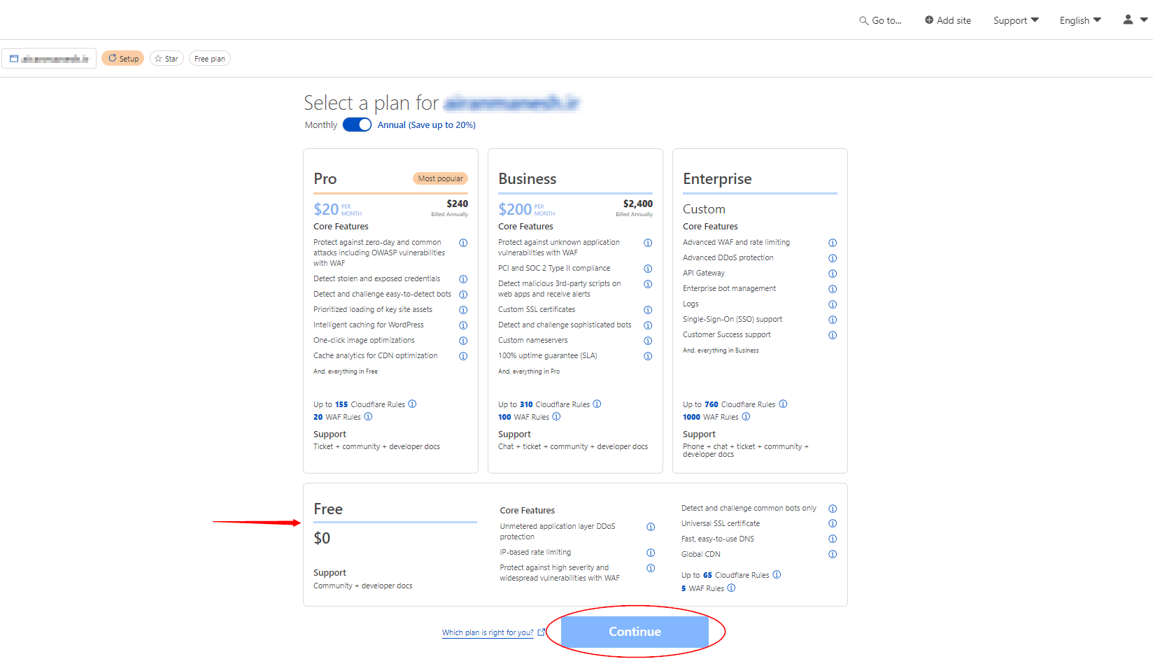در مرحله بعد باید پکیج خود را انتخاب کنید، با انتخاب پکیج Free از نسخه رایگان CDN استفاده خواهید کرد و با کلیک کردن بر روی گزینه Continue وارد مرحله بعد خواهید شد.