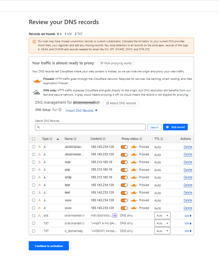 بعد از انتخاب پکیج، کلودفلر نسبت به اسکن رکوردهای دامنه شما اقدام میکند، که لیستی از رکوردهای شما نمایش داده خواهد شد، در صورتی که رکوردی نیاز به اصلاح یا اضافه کردن رکورد میباشد در همین مرحله باید انجام شود.
