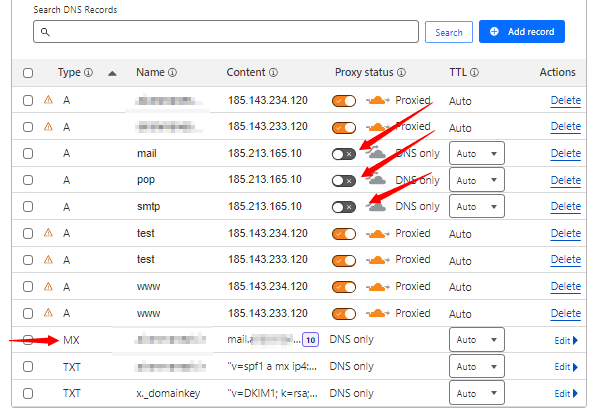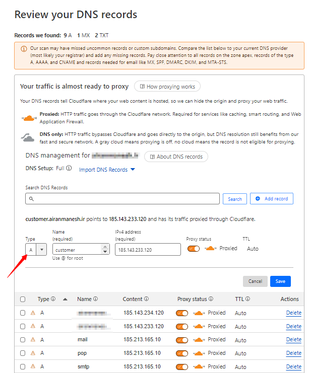 نکتهای که خیلی مهم و حائز اهمیت است، برای رکوردهای mail, pop, smtp حتماْ ابرهای CDN را خاموش کنید تا در ارسال و دریافت ایمیل، مشکلی بوجود نیاید.