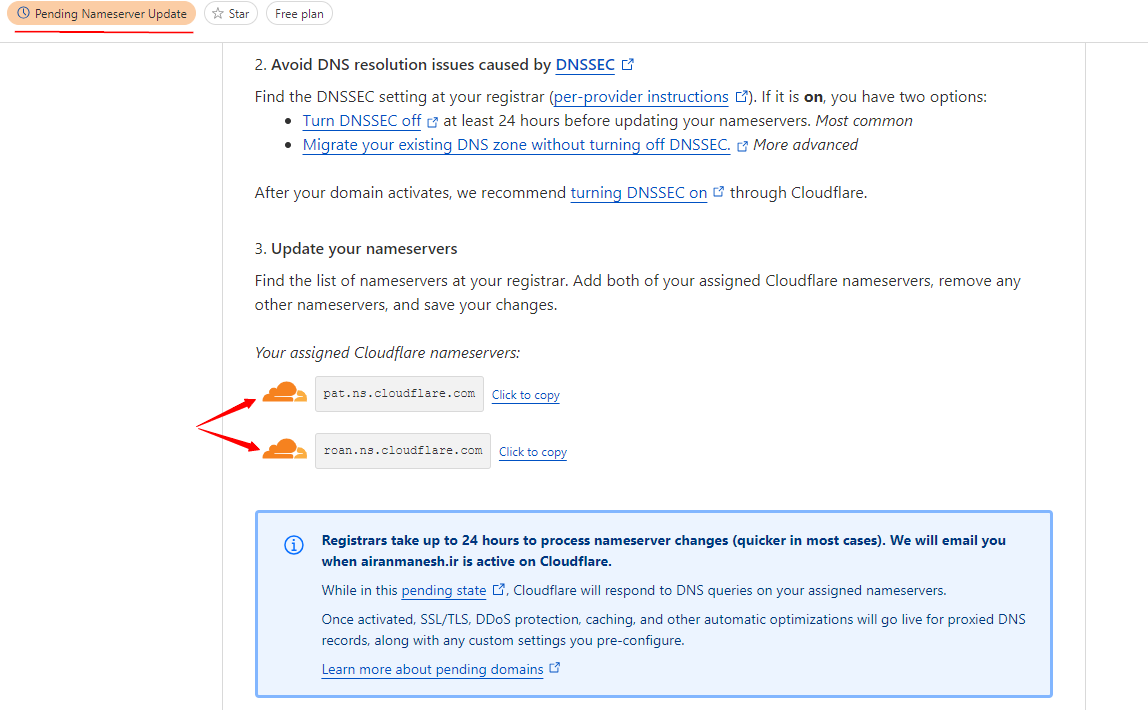 حالا کافیاست NSهایی که CDN کلودفلر به شما اعلام کرده است را در پنل دامنه خود تنظیم کنید تا اتصال دامنه شما به CDN کلودفلر انجام شود.