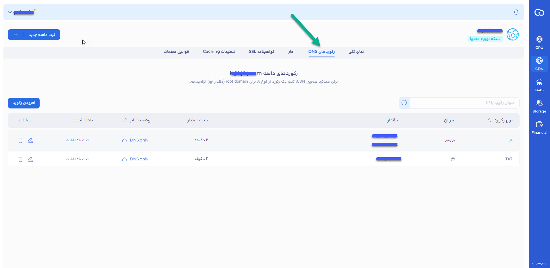 - از منو بالا روی رکورد های DNS کلیک کنید.