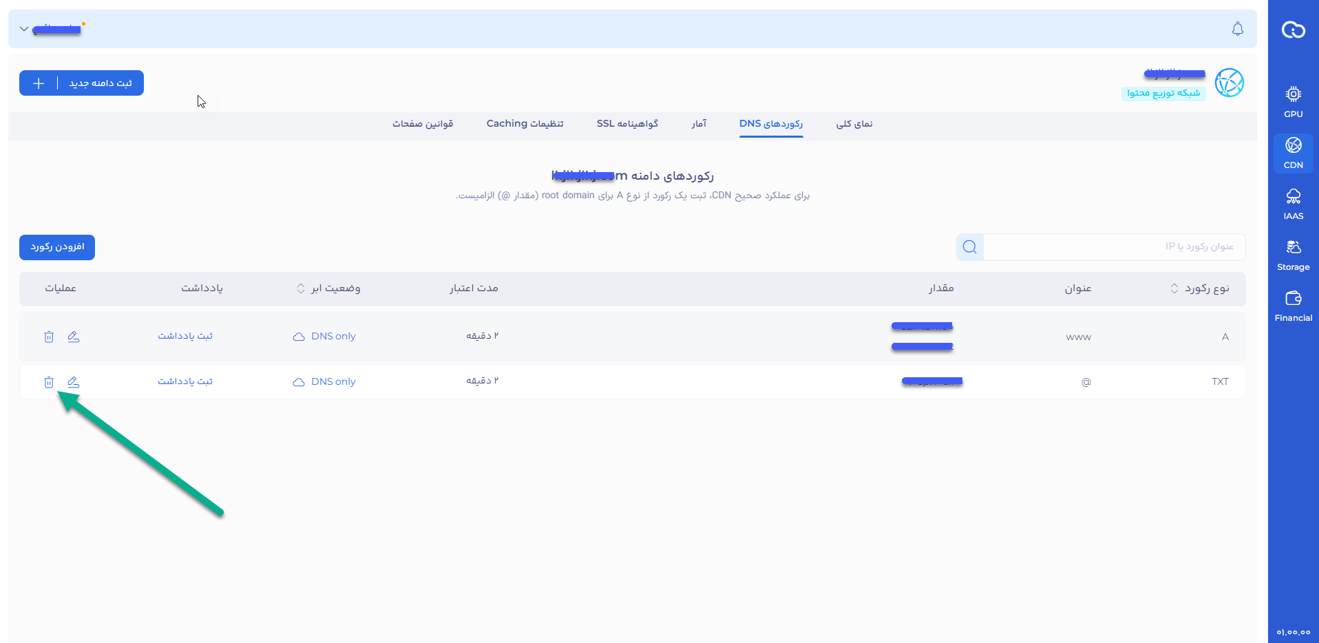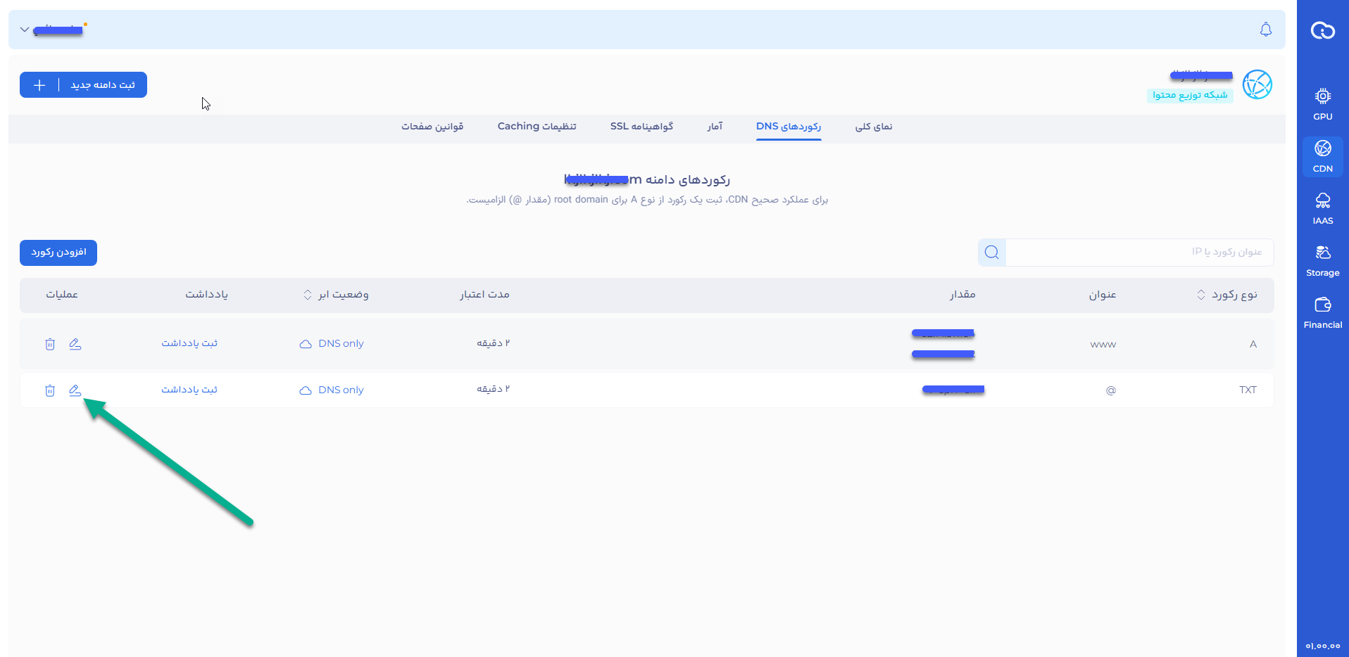 برای ویرایش رکورد در پنل ابر ایران سرور: