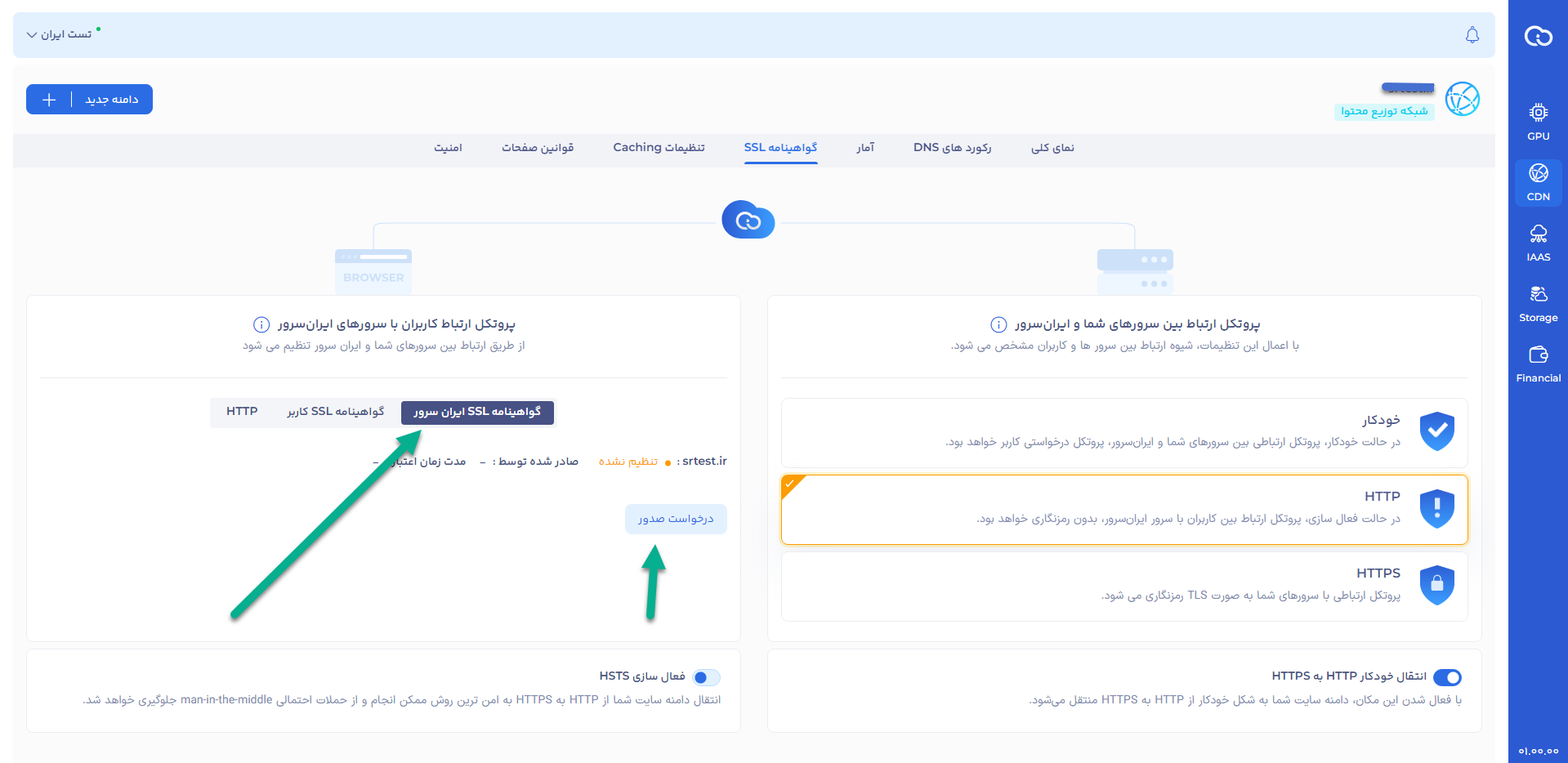 پس از تغییر NS ها، وارد صفحه مدیریت CDN بشوید و روی گزینه گواهینامه SSL کلیک کنید.