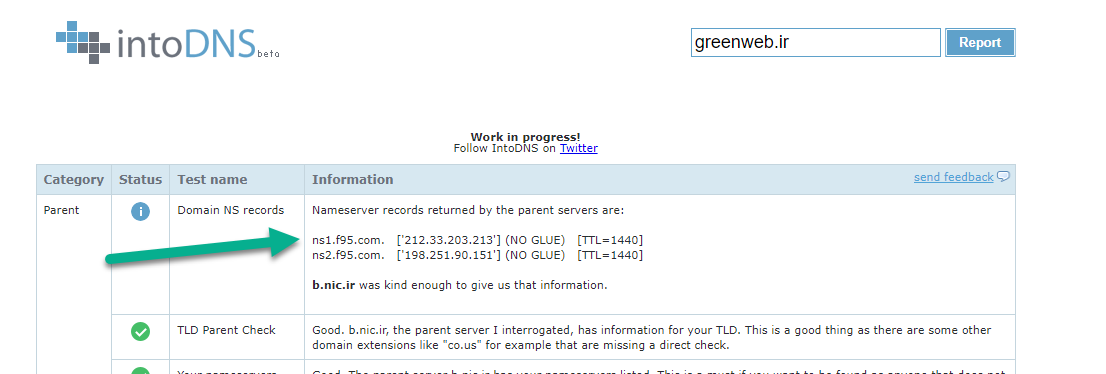 برای چک کردن اینکه آیا ns های شما تغییر کرده اند و یا خیر می توانید در سایت intodns.com کمک بگیرید.