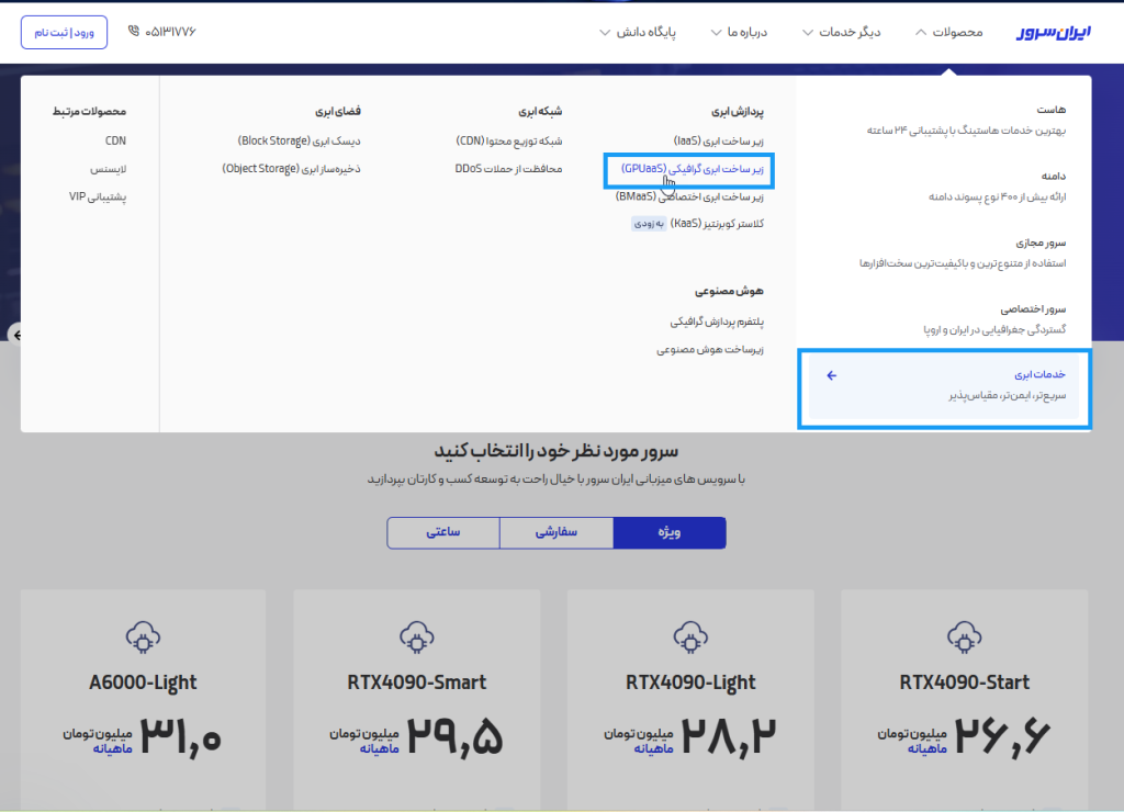 از منوی سایت، مسیر محصولات > خدمات ابری > زیرساخت ابری گرافیکی (GPUaaS) را انتخاب کنید.