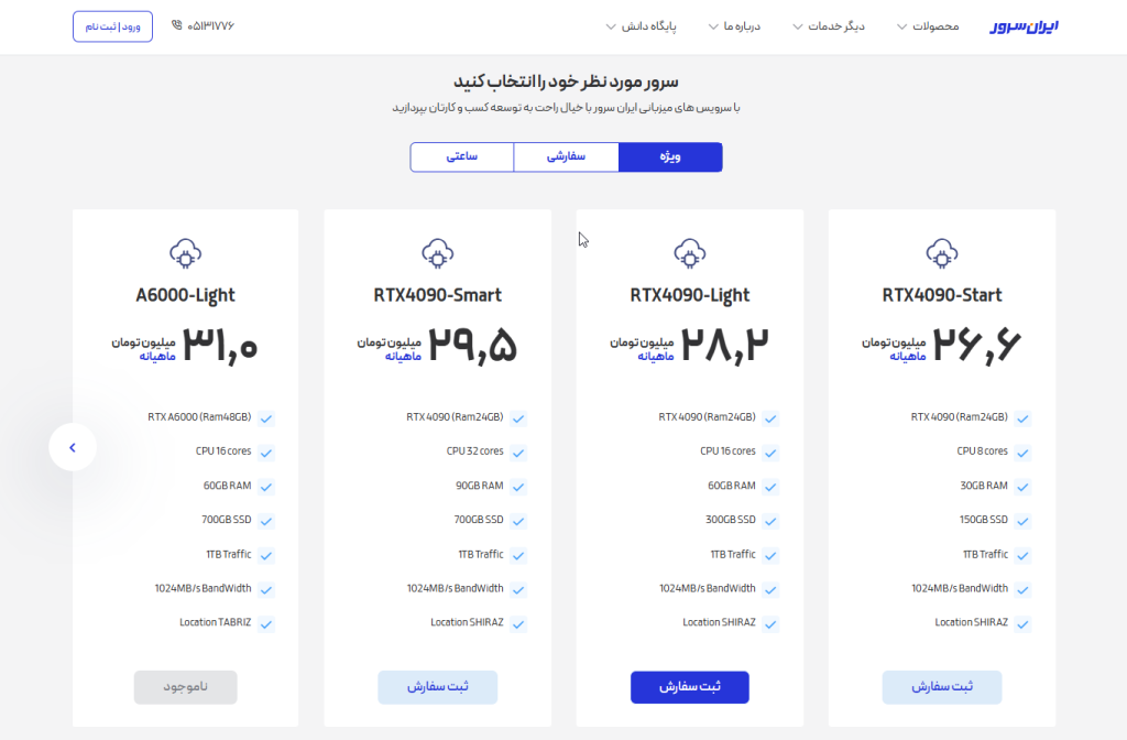 یکی از پلنهای موجود را بر اساس منابع مورد نیاز بررسی کرده و گزینه ثبت سفارش را انتخاب کنید.