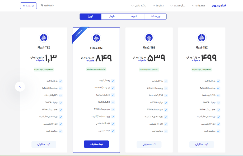 - سپس، با بررسی منابع هر پلن، گزینه مناسب را انتخاب کرده و روی ثبت سفارش کلیک کنید.