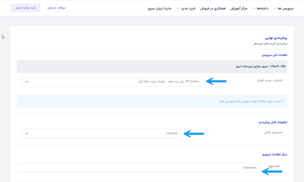 - ابتدا مشخص کنید که سرور شما روی کدام دیتاسنتر قرار گیرد (تبریز، شیراز یا تهران).