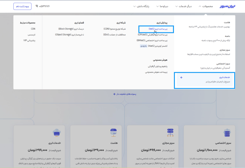 از منوی سایت، مسیر محصولات > خدمات ابری > زیرساخت ابری (IaaS) را انتخاب کنید