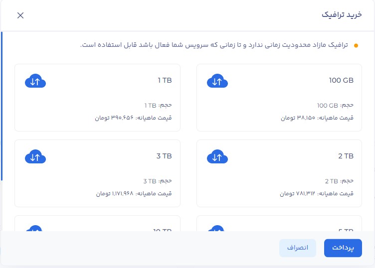 از این بخش میتوانید بسته ترافیکی مورد نظر خود را خریداری کنید. با خرید بسته جدید، حد مجاز ترافیک شما افزایش خواهد یافت. ترافیک مازاد را در هر لحظه از سیکل سرویس میتوان خریداری کرد.
