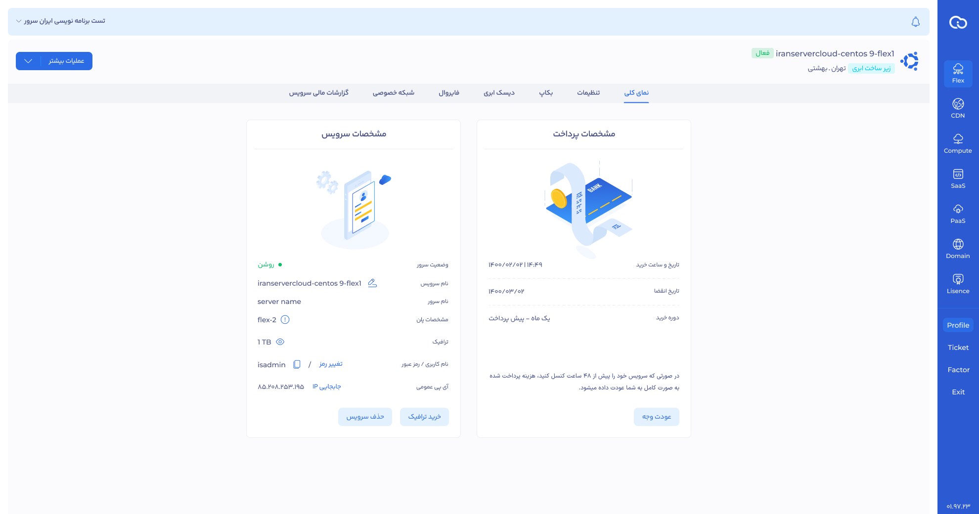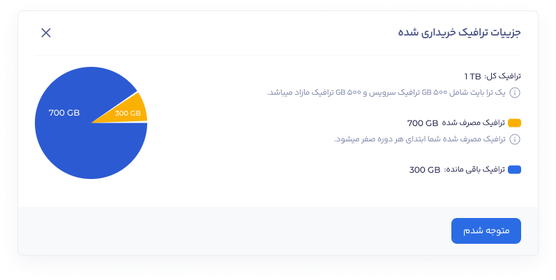 به دلیل محدودیتهای موجود در دیتاسنتر، امکان مصرف ترافیک بهصورت نامحدود وجود ندارد. میزان ترافیک پایه هر پلن در لیست پلنها و در مدیریت سرویس (بخش مشخصات سرویس، ترافیک) قابل مشاهده است.