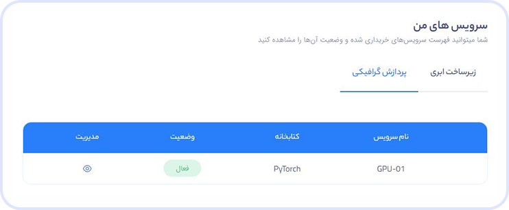سربرگ این قسمت فعال شده و تمام سرویسهای پردازش گرافیکی در جدول به شما نمایش داده میشود. برای دیدن جزئیات سرویس روی علامت «چشم» در ستون مدیریت جدول کلیک کنید.