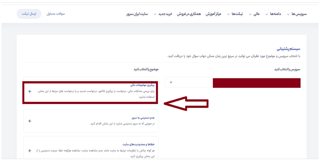 ۲- در ادامه بعد از انتخاب سرور هتزنر مربوطه در بخش سرویس، موضوع «پیگیری موضعات مالی» را انتخاب کنید.