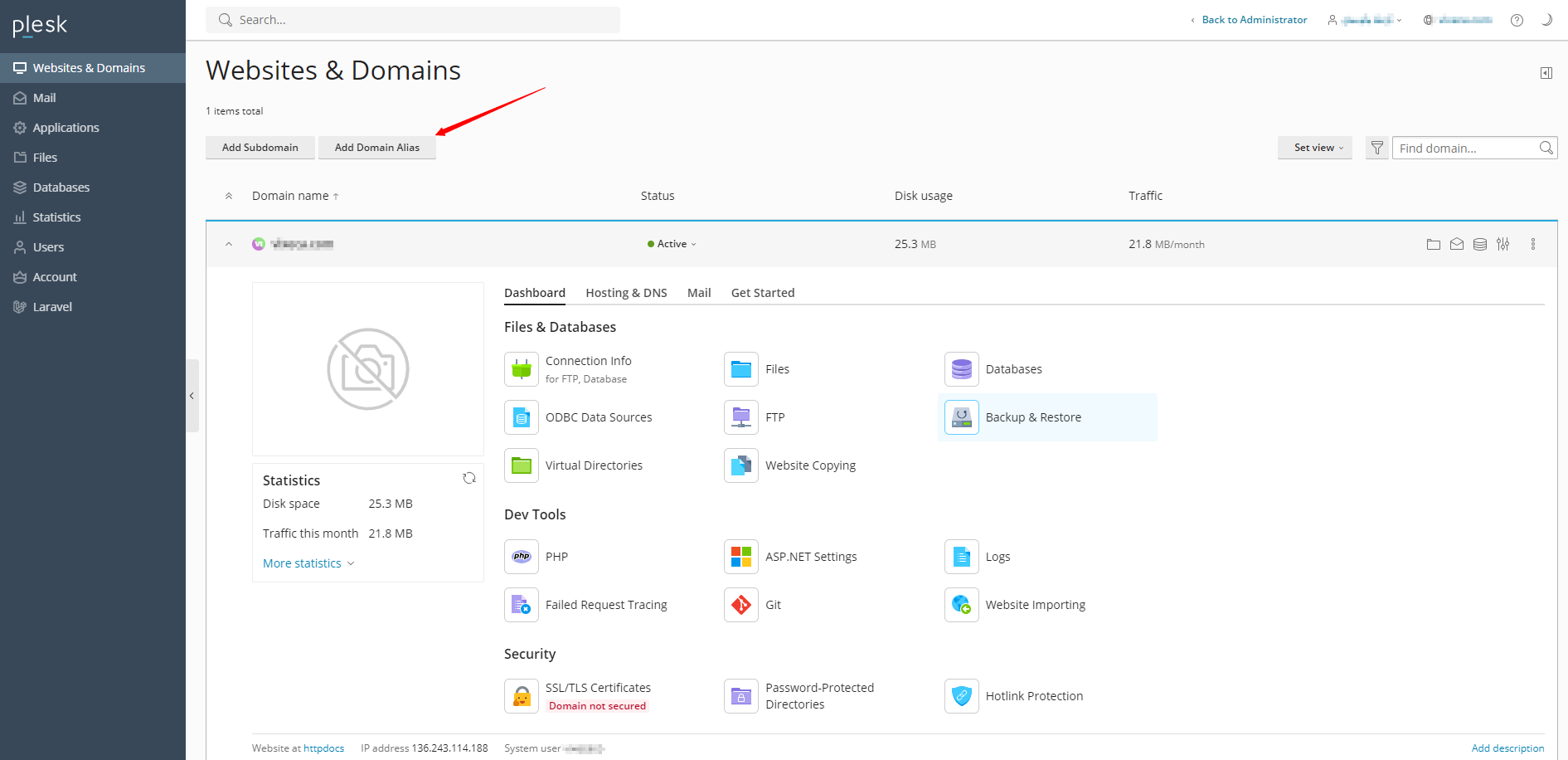 1- در بالای تنظیمات هاست خود ، بر روی گزینه Add Domain Alias کلیک کنید.