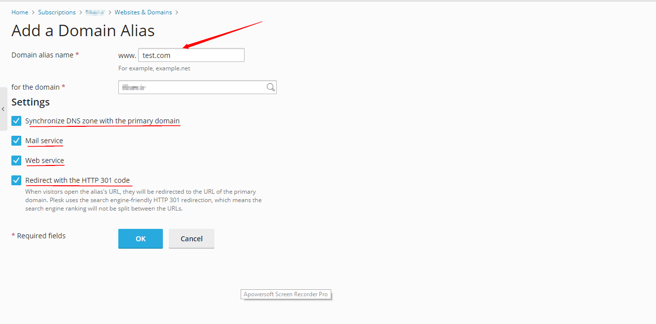 در اینجا نام دامنه به صورت تستی test.com تنظیم شده است.