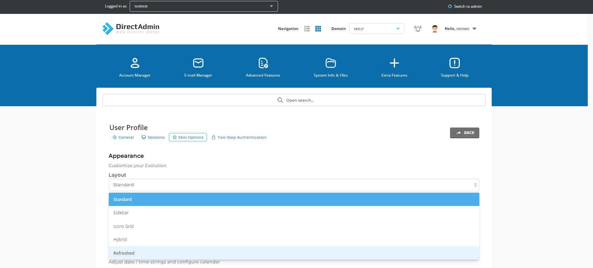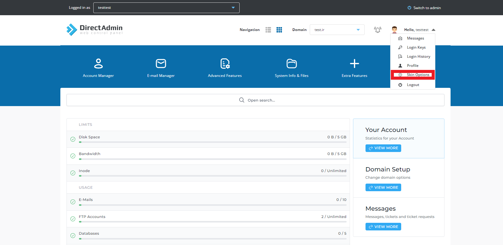 در کنترل پنل دایرکت ادمین بعد از ورود به کنترل پنل از قسمت بالا سمت راست (پروفایل شخصی) میتوانید گزینه Skin Options را انتخاب کنید.