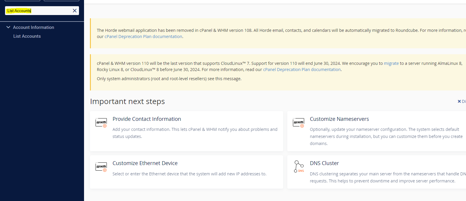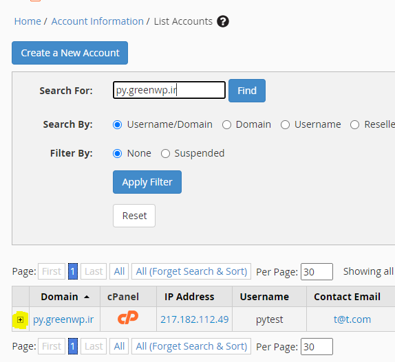 1-ابتدا وارد کنترل پنل از سطح whm شده و سپس در کادر جست و جوی سمت چپ کلمهList Accounts را وارد نمایید: