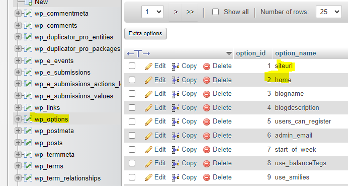 *اگر میخواهید از سمت دیتابیس نام دامنه را تغییر دهید در phpmyadmin بر روی دیتابیس کلیک کرده و بر روی تیبل wp_options کلیک نمایید . دو رکوردhome و siteurl را به نام دامنه جدید تغییر دهید.