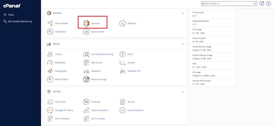 پس از ورود به کنترل پنل، شما تصویر زیر را مشاهده خواهید نمود.که گزینه Domainsبرای شما در تصویر مشخص شده است.