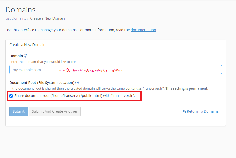 در این بخش دامنهای که قصد داریم بر روی دامنه اصلی پارک شود را وارد میکنیم و تیک گزینه Share document root را نیز میزنیم و سپس بر روی گزینه submit کلیک میکنیم.