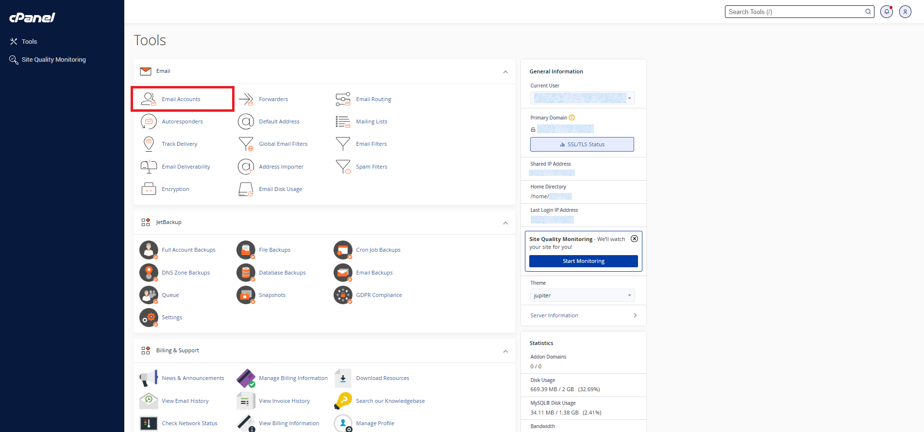 پس از ورود به سی پنل، از داشبورد اصلی به بخش Email Accounts بروید.