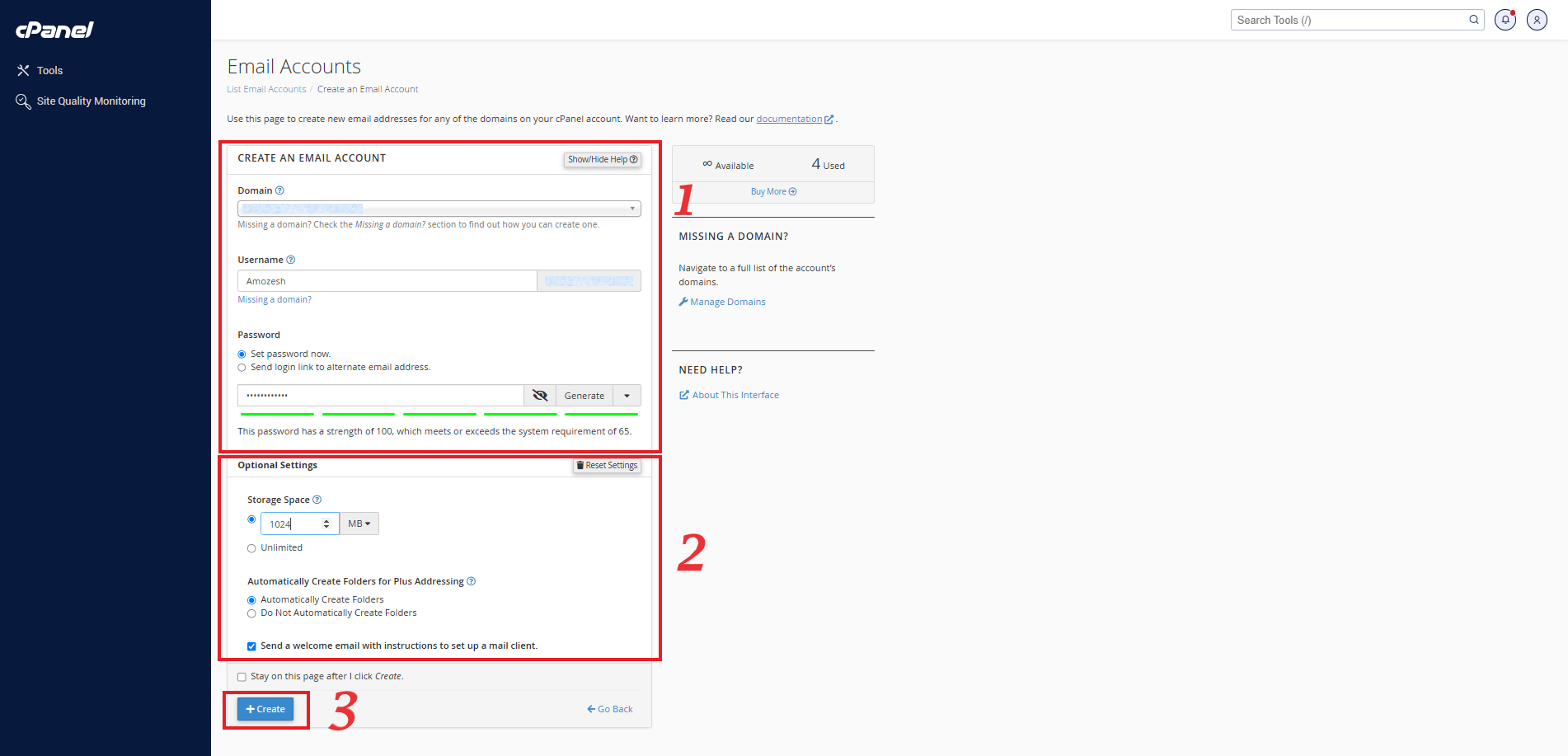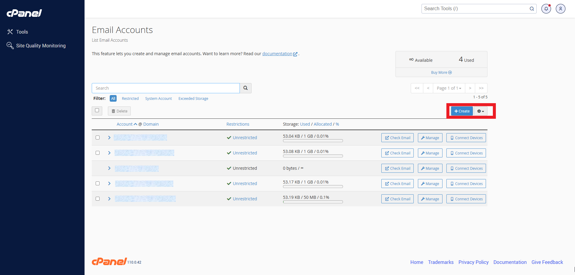 در بخش Email Accounts روی گزینه Create کلیک کنید.
