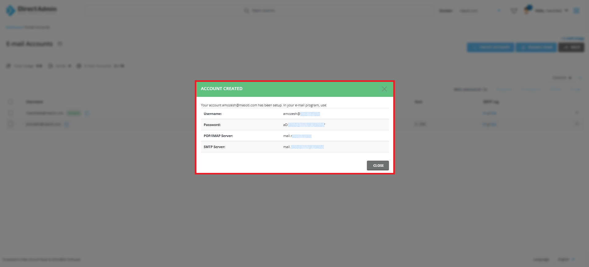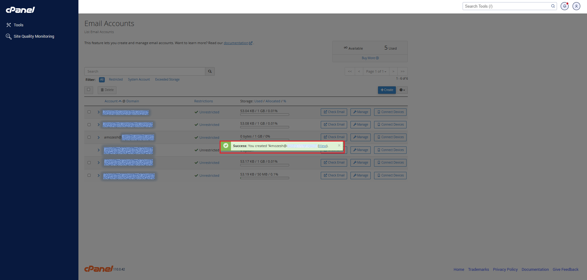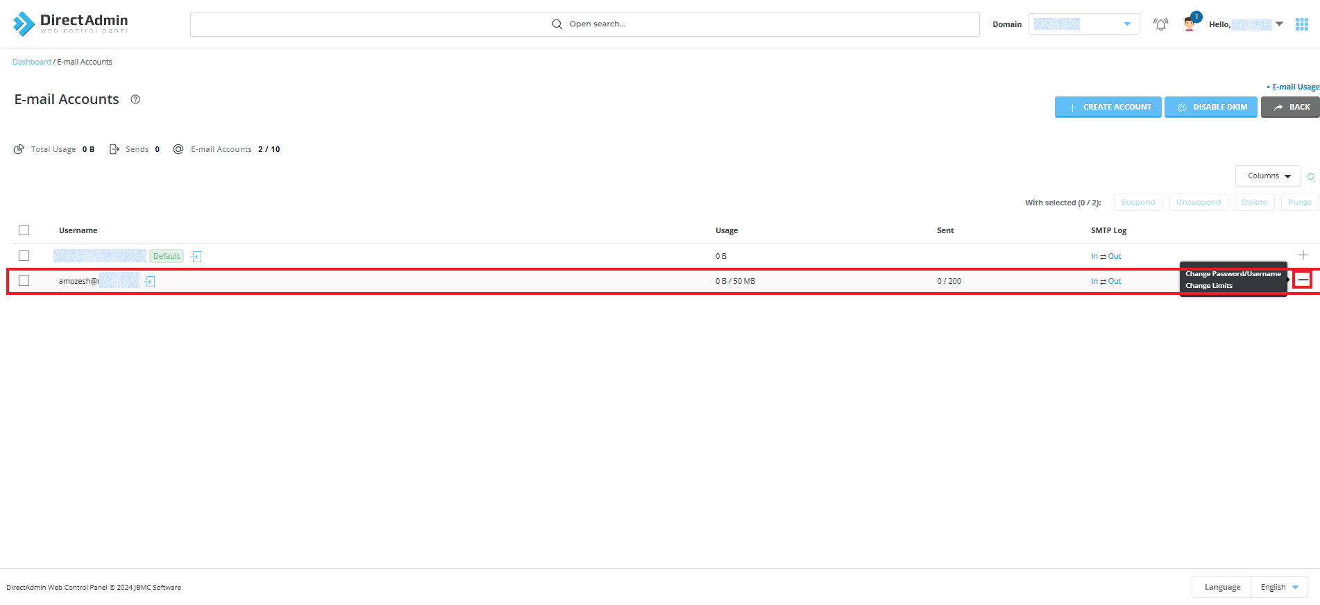 پس از ساخت حساب ایمیل، به لیستی از حسابهای ایمیل موجود در بخش Email Accounts دسترسی خواهید داشت. از اینجا میتوانید حسابهای خود را مدیریت کنید.