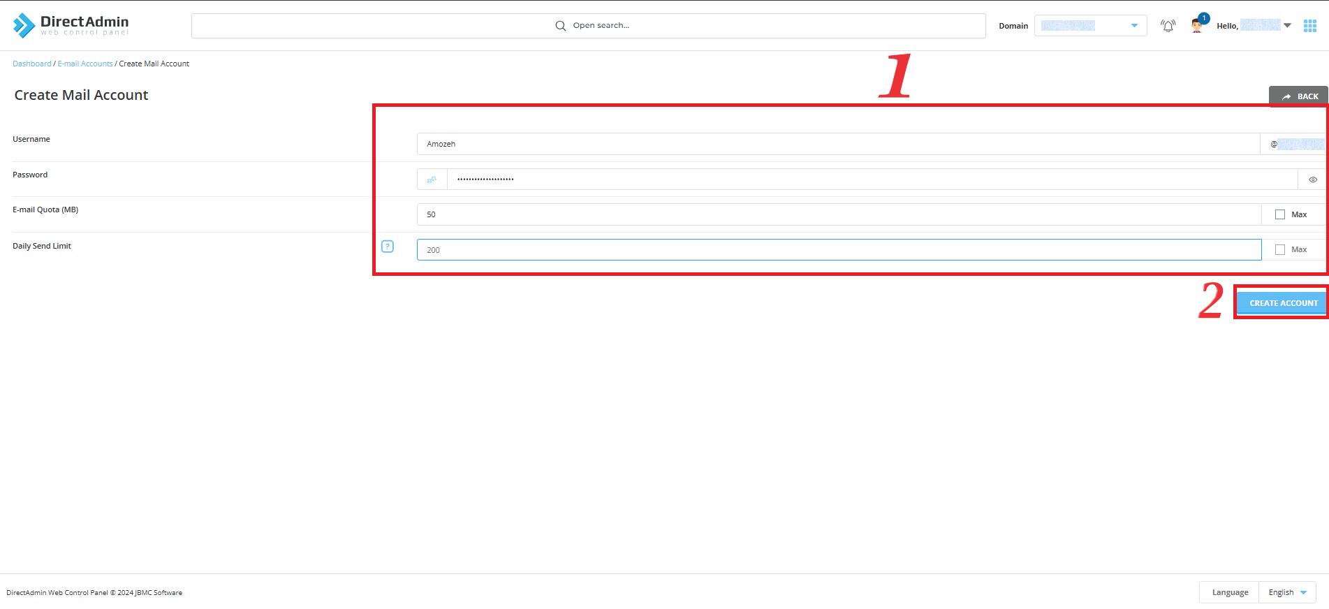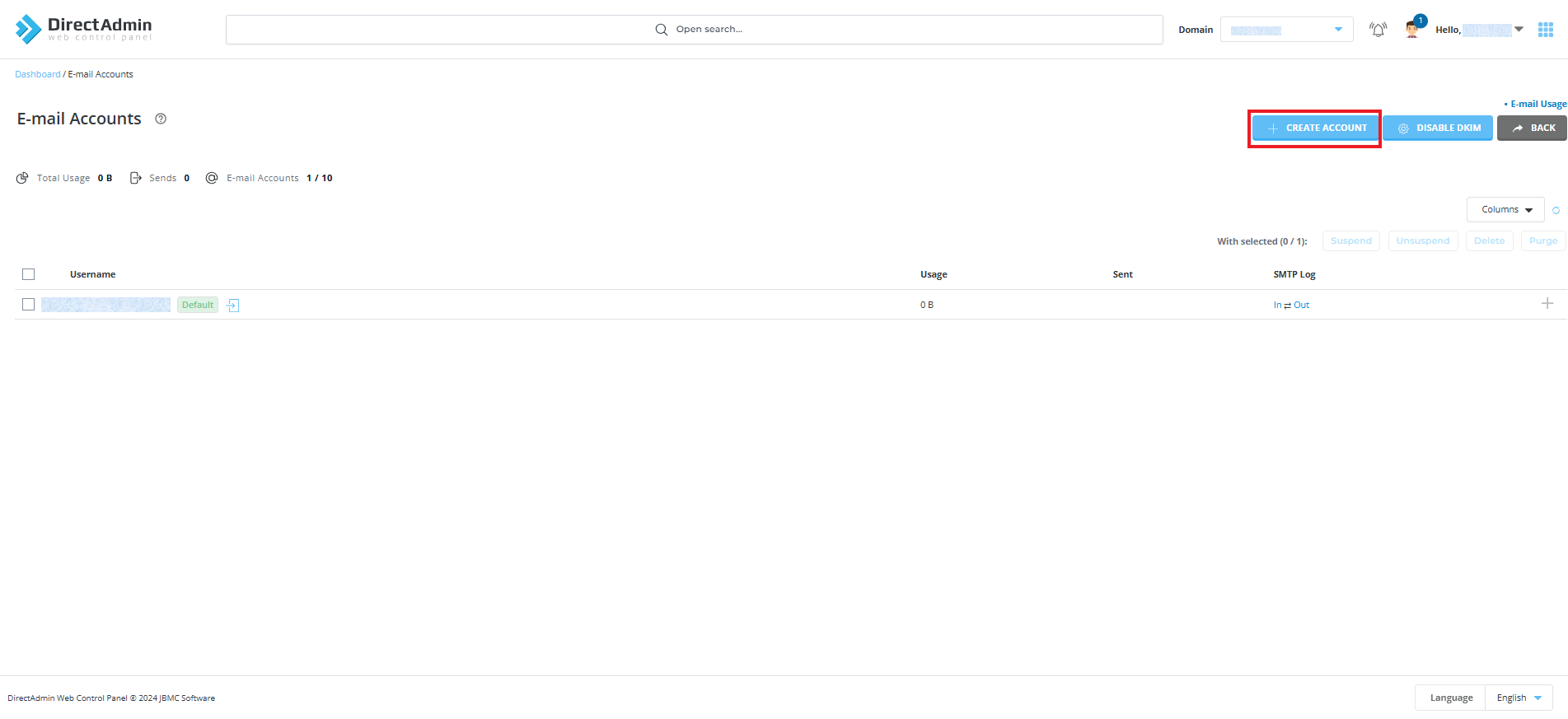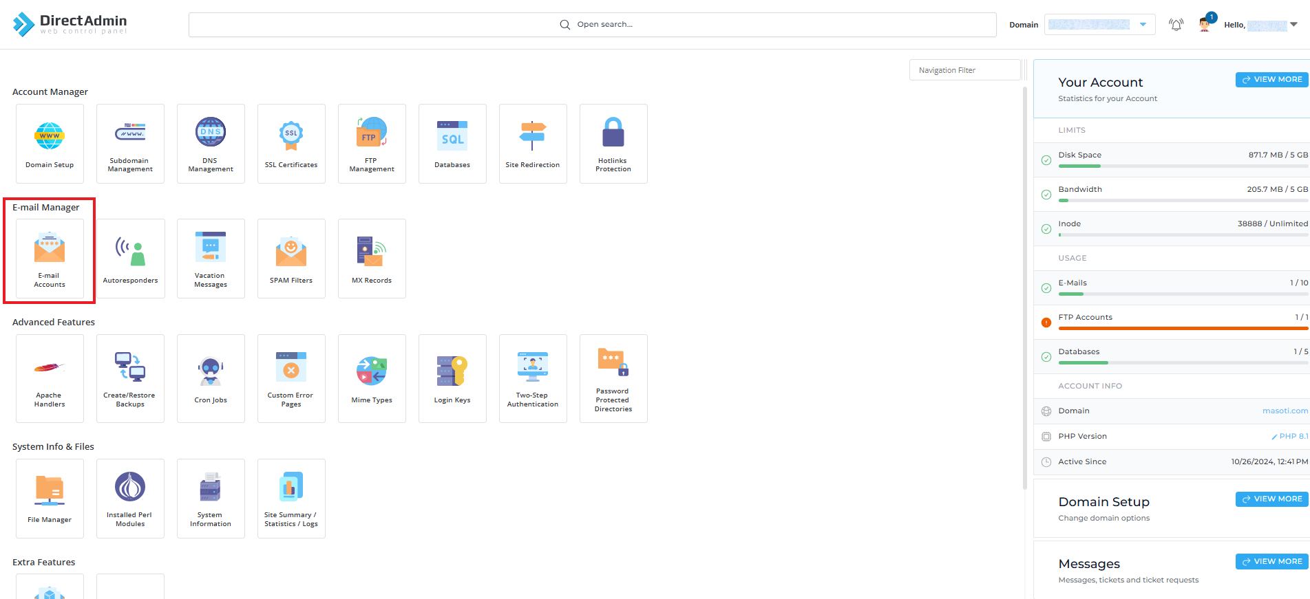 پس از ورود به دایرکت ادمین، به صفحه اصلی کنترل پنل بروید و گزینه Email Accounts را پیدا کنید. این بخش معمولاً در قسمت Email Manager قرار دارد.