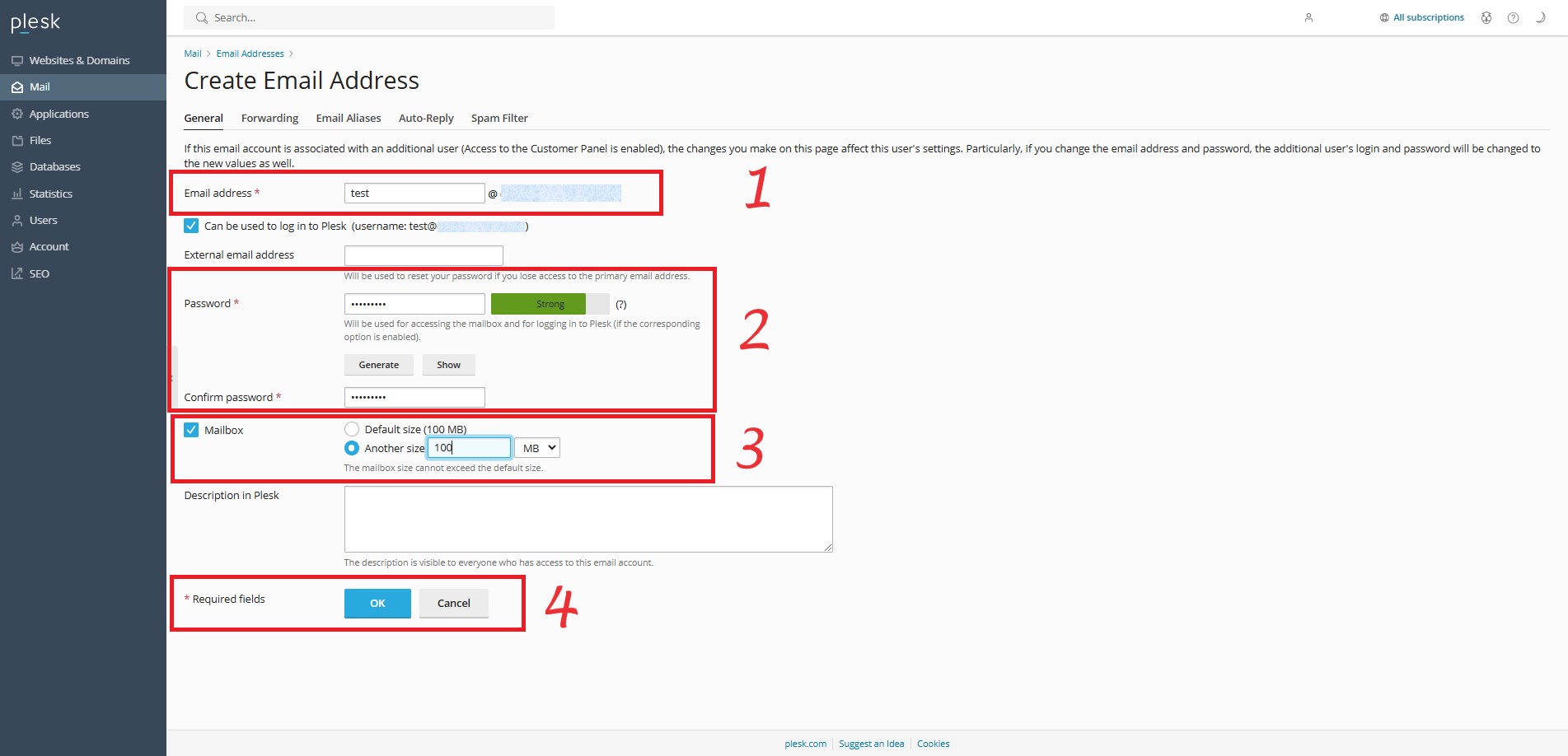 3- اگر مایلید، میتوانید Mailbox Quota میزان فضای ذخیرهسازی اختصاص داده شده به این حساب ایمیل را تعیین میکند. برای تنظیم سهمیه، مقدار فضا را در واحد مگابایت (MB) وارد کنید.