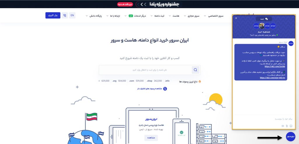 چت آنلاین از دیگر راههای ارتباطی شما با پشتیبانی ایرانسرور است. برای استفاده از این قابلیت نیازی نیست وارد پنل کاربری خود شوید. درواقع هر زمان که وارد صفحه اصلی ایرانسرور به نشانی iranserver.com شوید، میتوانید به صورت آنلاین با پشتیبانها چت کنید.
