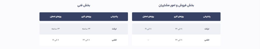 همانطور که گفتیم پشتیبانی ایرانسرور در 7 روز هفته و 24 ساعت شبانهروز آماده پاسخگویی به شما است. برای اینکه سریعتر بتوانید پاسخ سوال خود را دریافت کنید، میتوانید از جدول زمانبندی زیر برای ارتباط با پشتیبانی استفاده کنید.