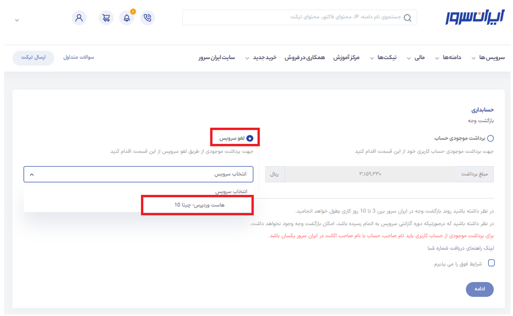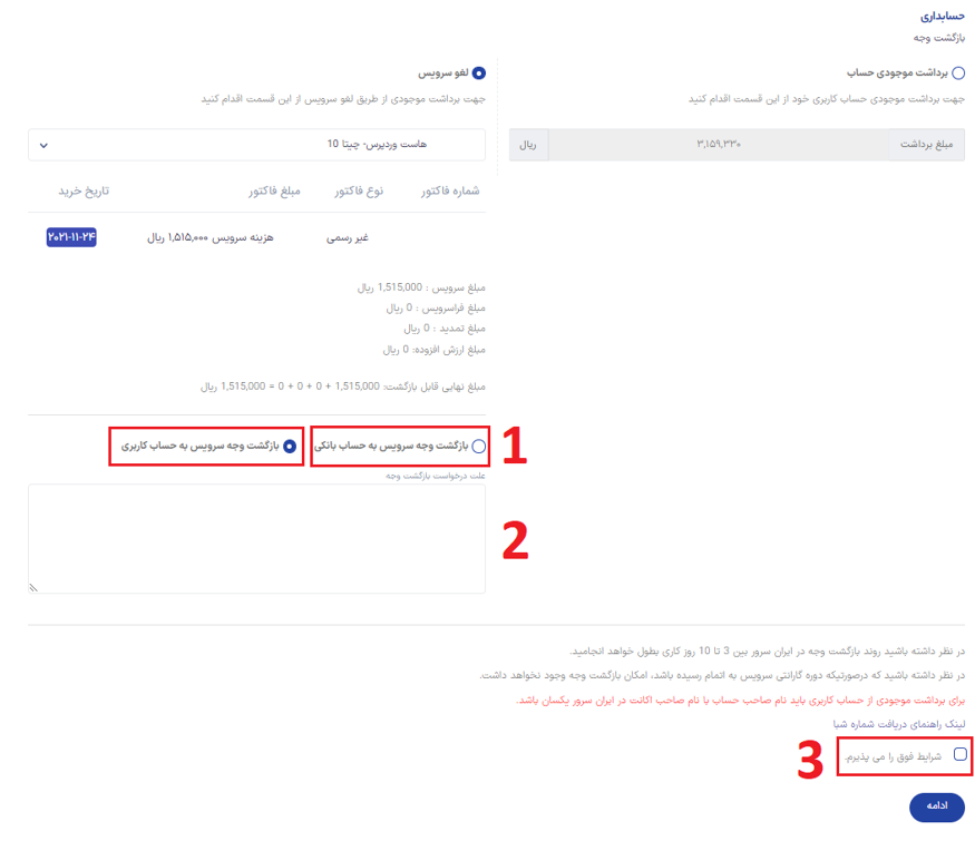 طبق عکس پایین، در بخش (۱) میتوانید مشخص کنید که هزینهی بازگشتی به اعتبار حساب کاربری ایرانسرور بازگشت داده شود یا به حساب بانکیتان واریز شود.