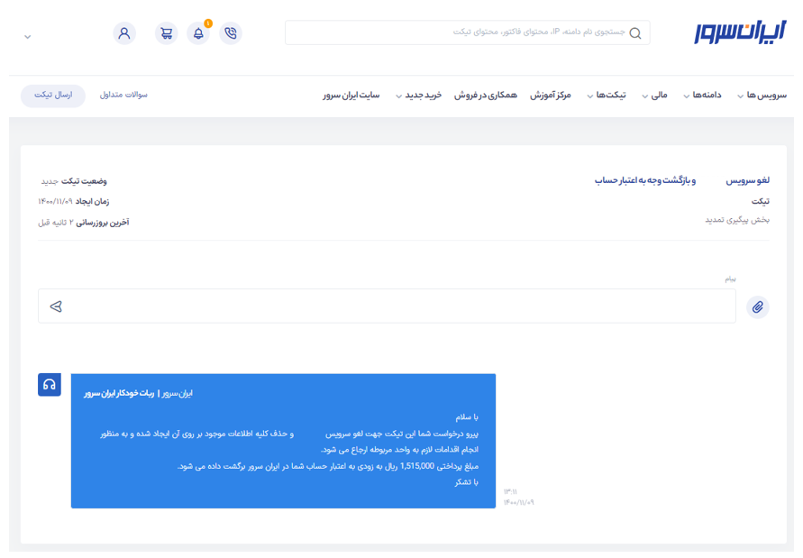 پس از کلیک بر روی گزینهی «ادامه» یک تیکت جهت لغو سرویس برای شما ایجاد خواهد شد که در آن فرآیند لغو سرویس و بازگشت وجه انجام خواهد شد.