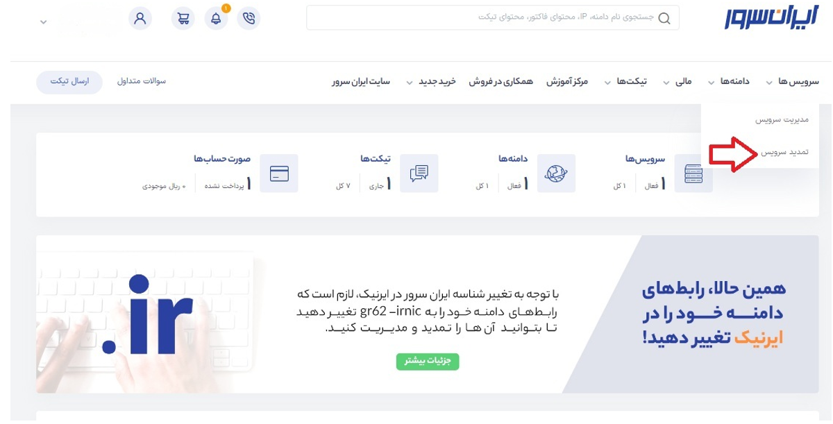 جهت تمدید زودتر از موعد نیاز است پس از وارد شدن به پنل کاربری از سربرگ «سرویسها» گزینهی «تمدید سرویس» را انتخاب نمایید.
