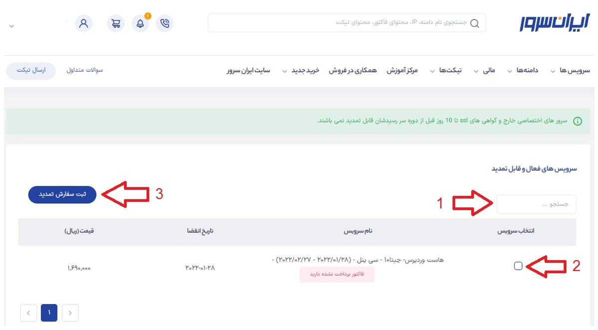 در صفحهی جدید، میتوانید به کمک قسمت جستجو سرویس فعال مورد نظر را پیدا کرده و پس از انتخاب آن بر روی «ثبت سفارش تمدید» کلیک کنید.