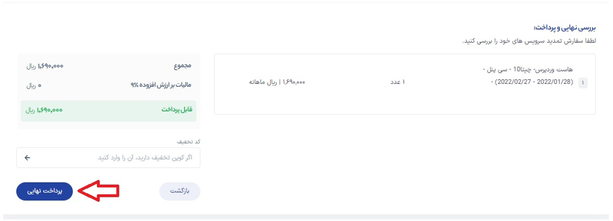 در صفحۀ بعدی سبد خرید را بررسی کنید و از صحت سرویس انتخاب مطمئن شود.