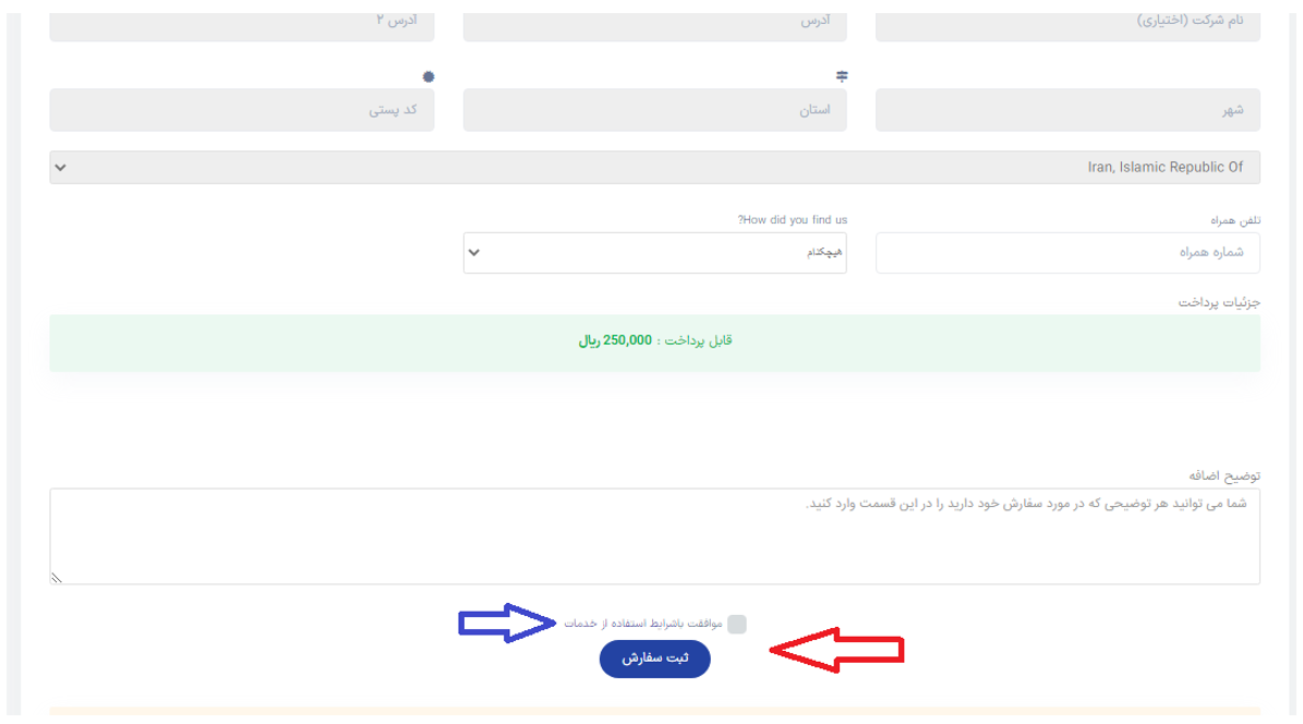 نهایتا شما میتوانید با تایید اطلاعات ثبت شده در سیستم و مرور آنها، در پایین صفحه روی تیک مربوط به «موافقیت با شرایط استفاده از خدمات» کلیک و وضعیت سفارش خود را نهایی کرده تا در صفحۀ بعدی پیش فاکتور مربوط به سفارش را مشاهده کنید.
