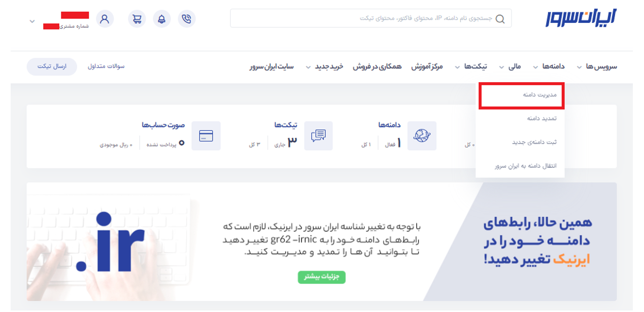 ابتدا نیاز است در پنل کاربری خود از سربرگ «دامنهها» گزینهی «مدیریت دامنه» را انتخاب کنید.