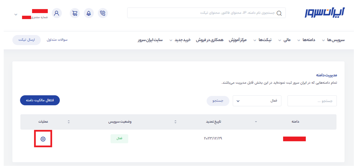 سپس بر روی آیکن چرخدندهٔ مربوط به دامنه کلیک کنید.