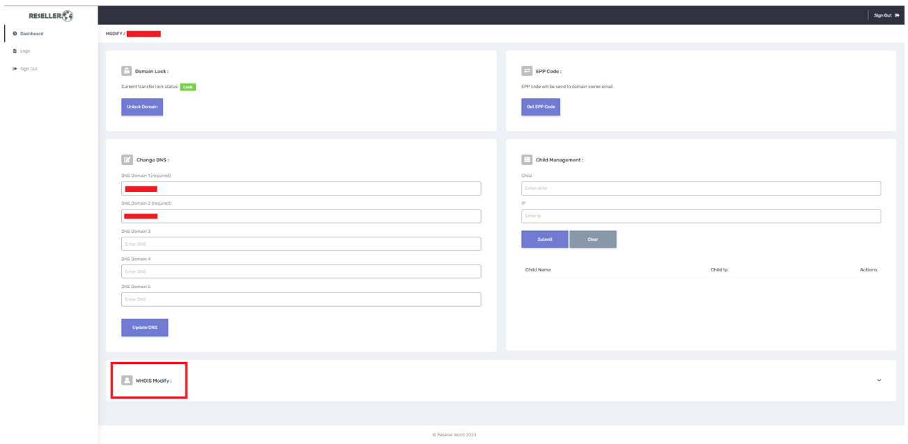 در کنترل پنل دامنه، از طریق بخش Whois Modify امکان مدیریت اطلاعات Whois دامنه میسر است.