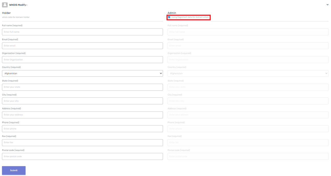اگر نیاز به تعریف شخص ثانویه به عنوان رابط فنی دامنهٔ خود ندارید، میتوانید تنها فرم سمت چپ را پر کرده و تیک گزینهی «Using Registrant data for domain Whois» را فعال کنید.