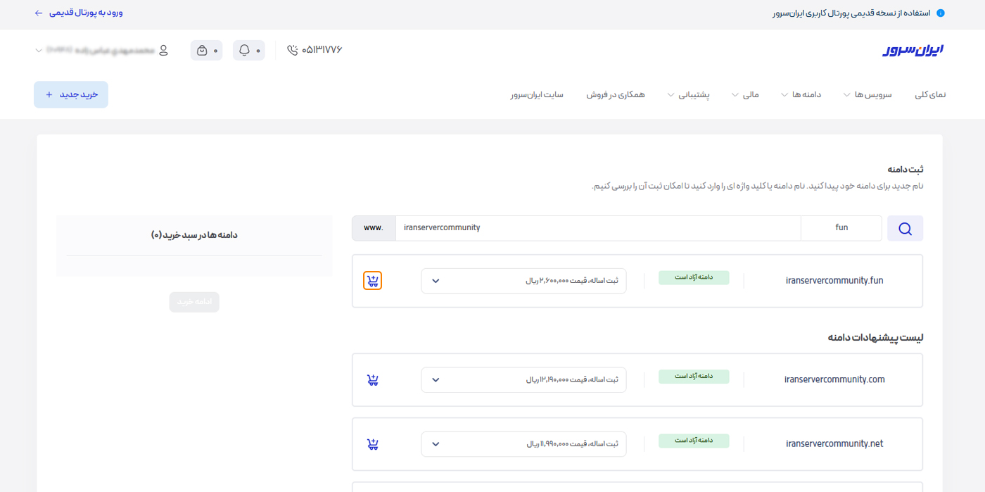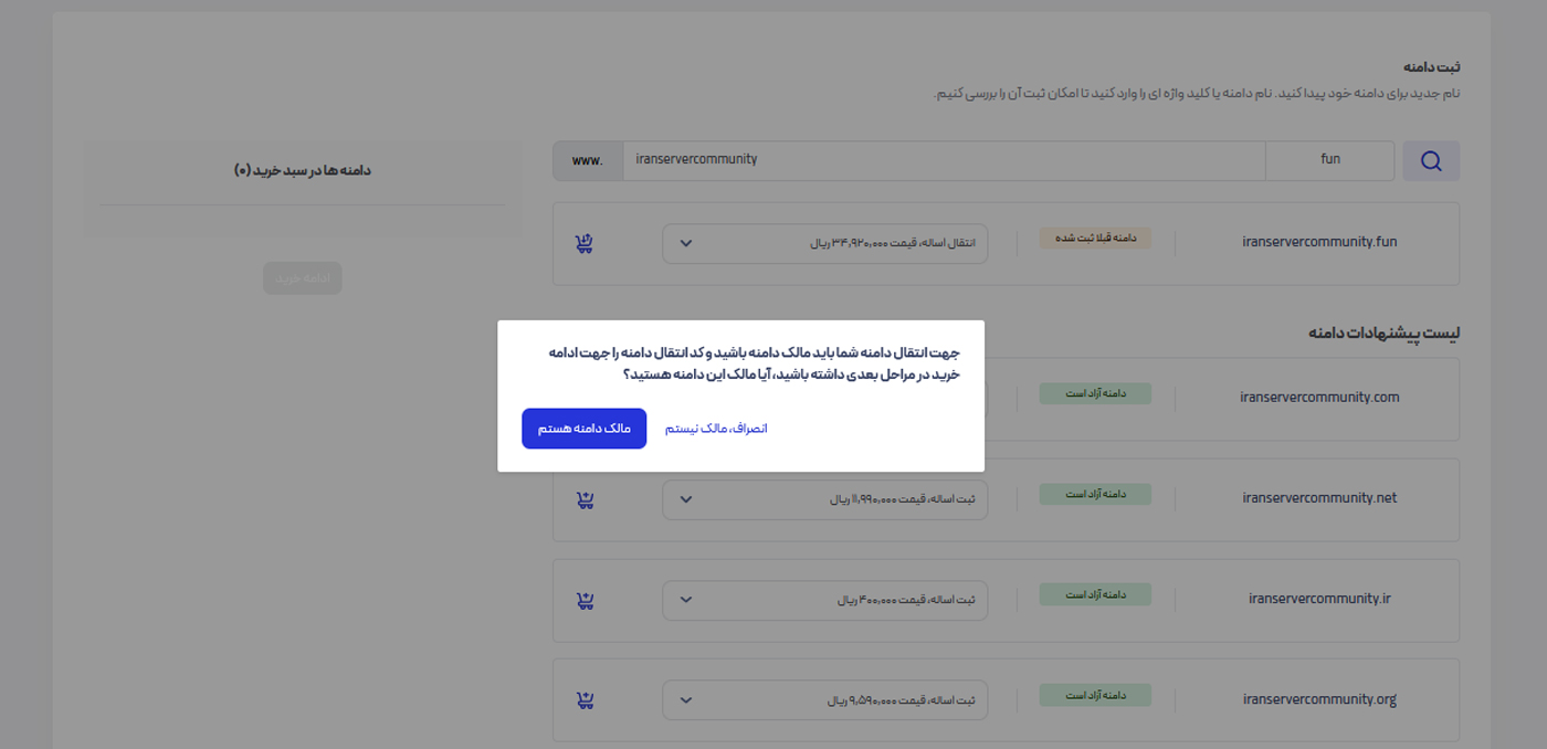 اگر دامنه آزاد بود، روی دکمه “افزودن به سبد خرید” کلیک کنید؛ و برای تکمیل مراحل روی دکمه”ادامه خرید” کلیک کنید.