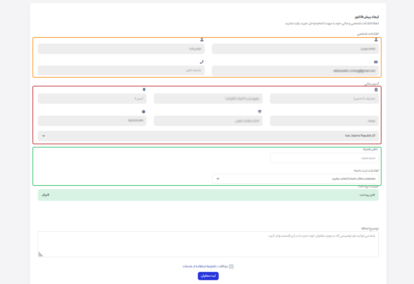بعد از مطالعه کامل شرایط استفاده از خدمات، تیک موافقت را بزنید و روی دکمه “ثبت سفارش” کلیک کنید.