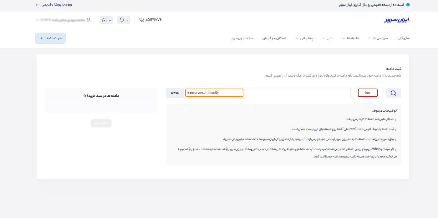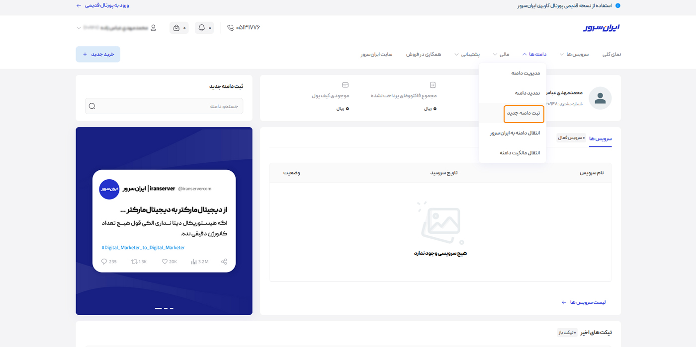 از منوی بالای صفحه کاربری، گزینه “دامنهها” را انتخاب کنید و سپس روی گزینه “ثبت دامنه جدید” کلیک کنید.