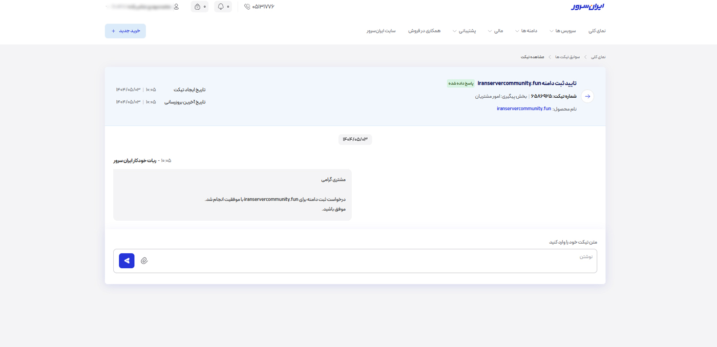 در این مرحله یک تیکت از طرف پشتیبانی ایرانسرور ارسال میشود که ثبت دامنه را اطلاع میدهد.
