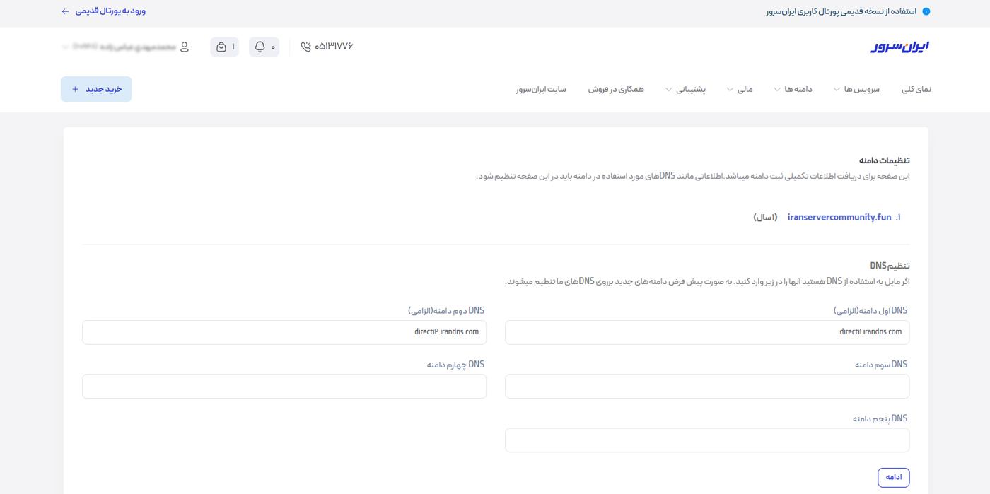 این مرحله جزء اطلاعات تکمیلی ثبت دامنه میباشد. اطلاعاتی مانند DNSهای مورد استفاده در دامنه باید در این صفحه تنظیم شود. اگر مایل به استفاده از DNS هستید، آنها را در فیلدهای زیر وارد کنید. به صورت پیشفرض دامنههای جدید بر روی DNSهای ایرانسرور تنظیم میشوند. تعویض این موارد بعدا هم امکان پذیر خواهد بود. بعد از تکمیل این مرحله روی دکمه ادامه کلیک کنید.