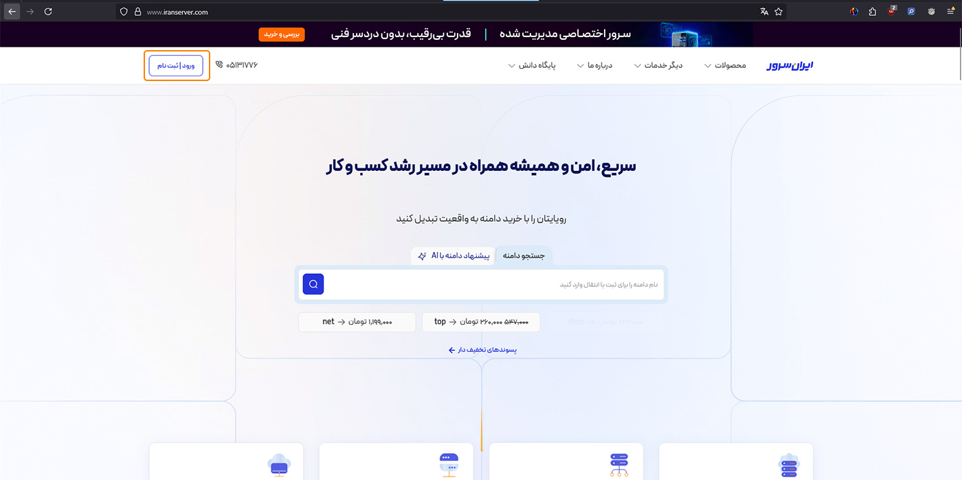 ابتدا وارد مرورگر شوید و آدرس iranserver.com را بنویسید و اینتر را بزنید. در بالای صفحه، روی گزینه ” ورود | ثبت نام” کلیک کنید.