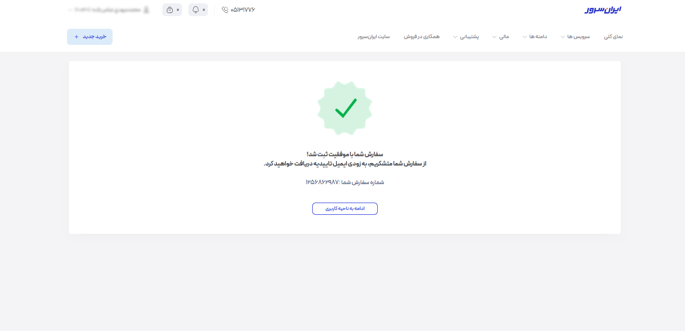 پس از انجام مراحل قبلی، پیامی با عنوان “سفارش شما با موفقیت ثبت شد!” نمایش داده میشود که نشان می دهد همه مراحل قبلی به صورت صحیح انجام شده است. روی دکمه “ادامه به ناحیه کاربری” کلیک کنید.