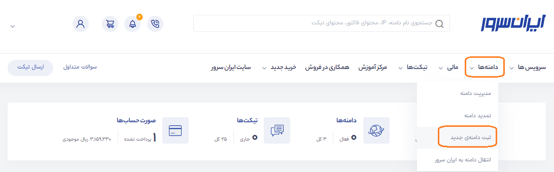 در ابتدا لازم است در پنل کاربری خود از سربرگ «دامنهها» گزینهٔ «ثبت دامنهٔ جدید» را انتخاب کنید.